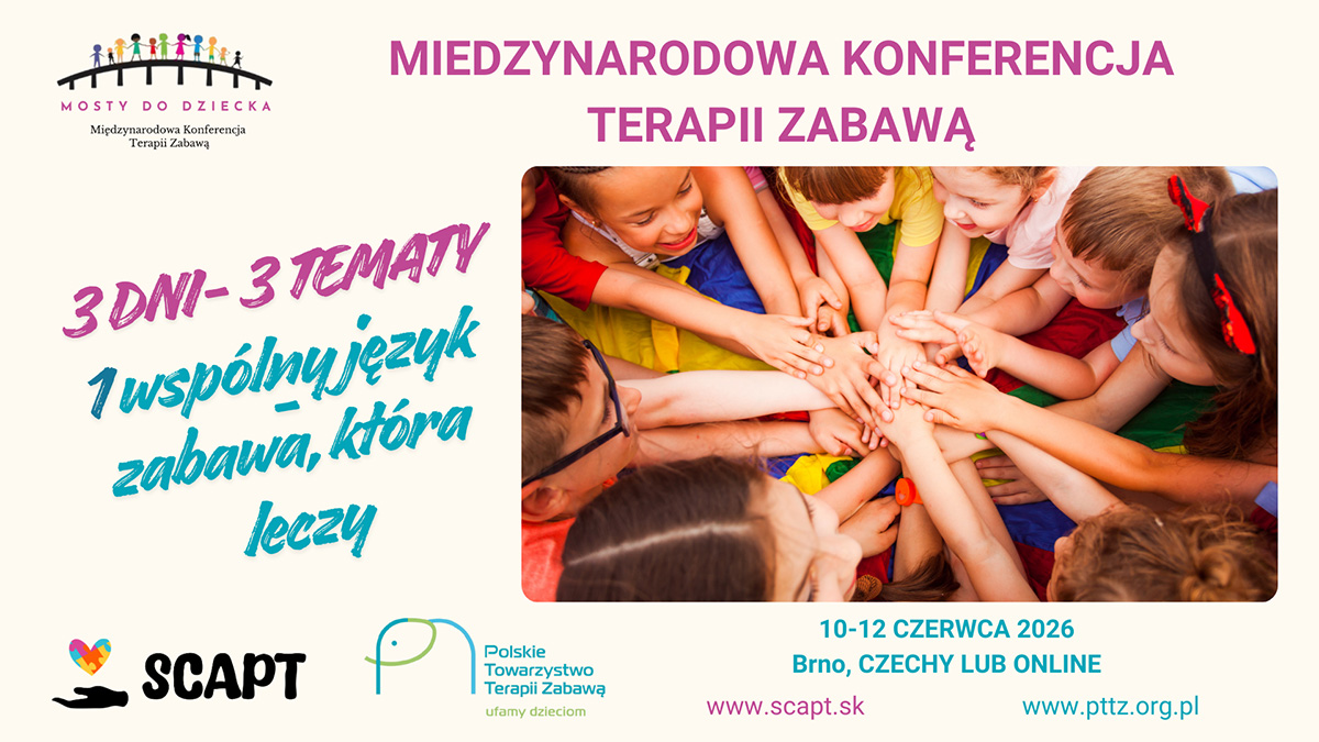 Polskie Towarzystwo Terapii Zabawą (PTTZ) oraz Słowacko–Czeskie Stowarzyszenie Terapii Zabawą (SCAPT) serdecznie zapraszają swoich członków, terapeutów zabawą, psychologów, psychoterapeutów oraz wszystkich, którzy chcą rozwijać się zawodowo, wzmacniać swoje kompetencje terapeutyczne i budować nowe „mosty” prowadzące do głębokiego zrozumienia dziecka na Międzynarodową Konferencję Terapii Zabawą: MOSTY DO DZIECKA.